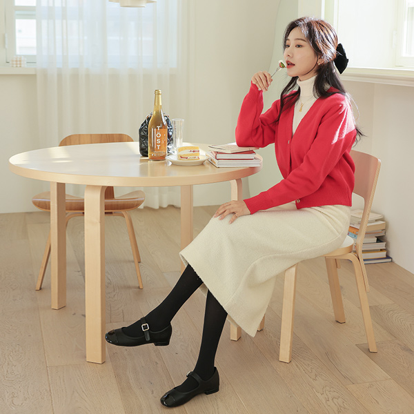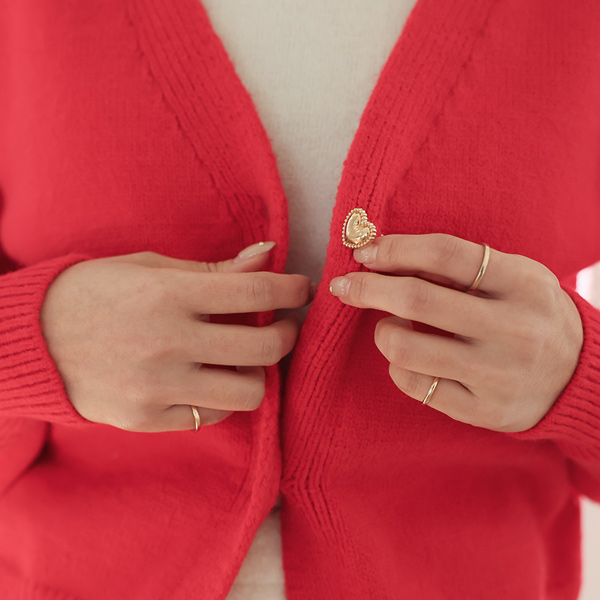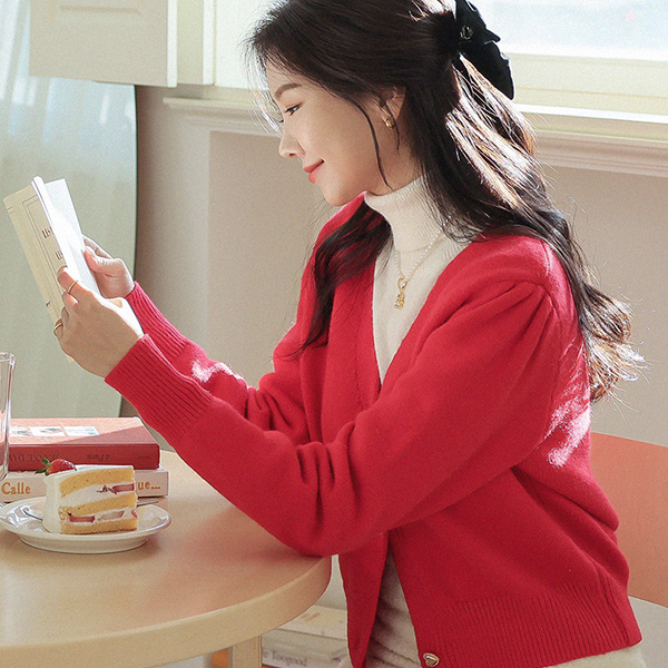 Lovely Gold Ring Heart button Volume puff Wool Cardigan