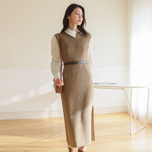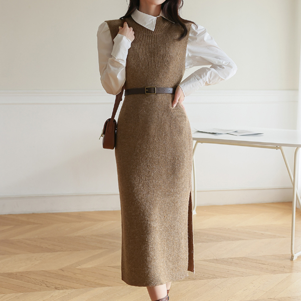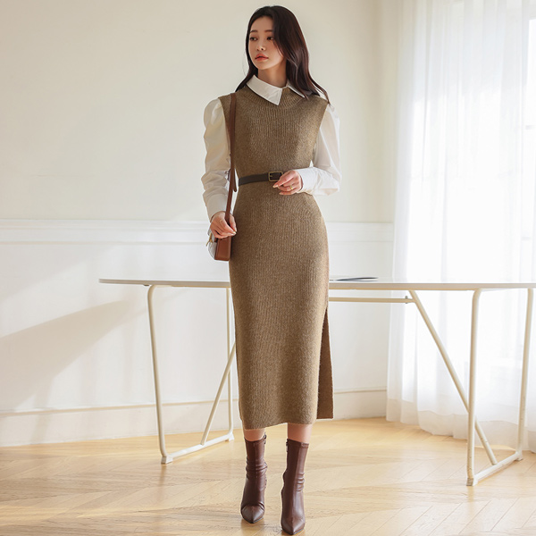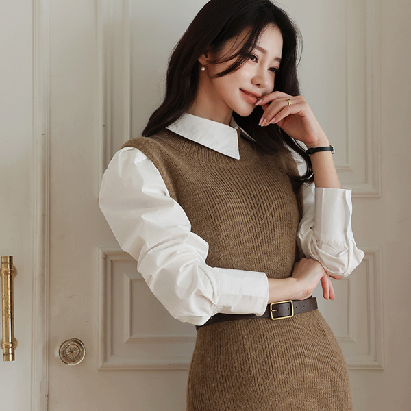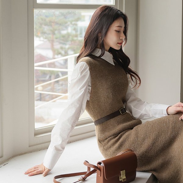 셔츠와 롱 니트 원피스가 세트로 구성되어