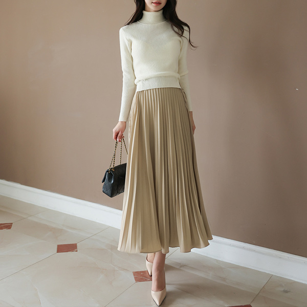 폴라넥 니트와 플리츠 스커트를 매칭한 듯