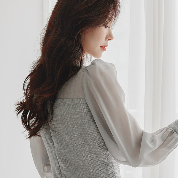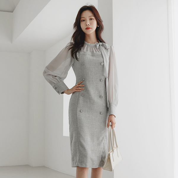 Double Button See-through Ribbon Shirring Tweed Dress
