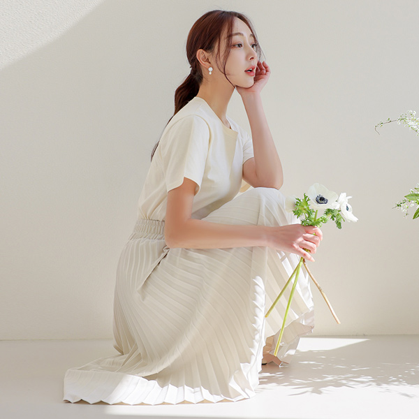 밑단으로 갈수록 퍼지는 플리츠 라인으로