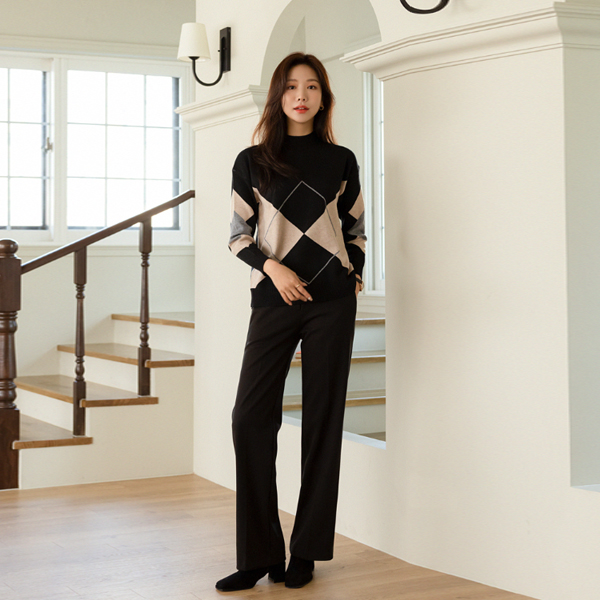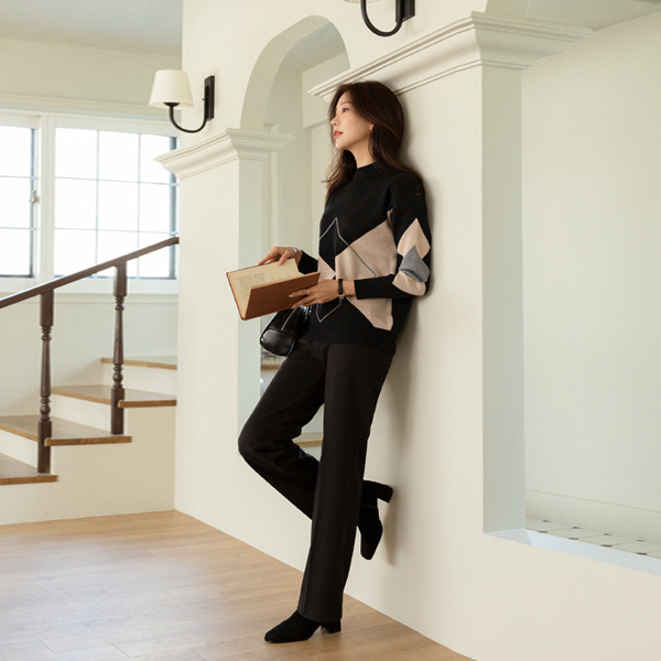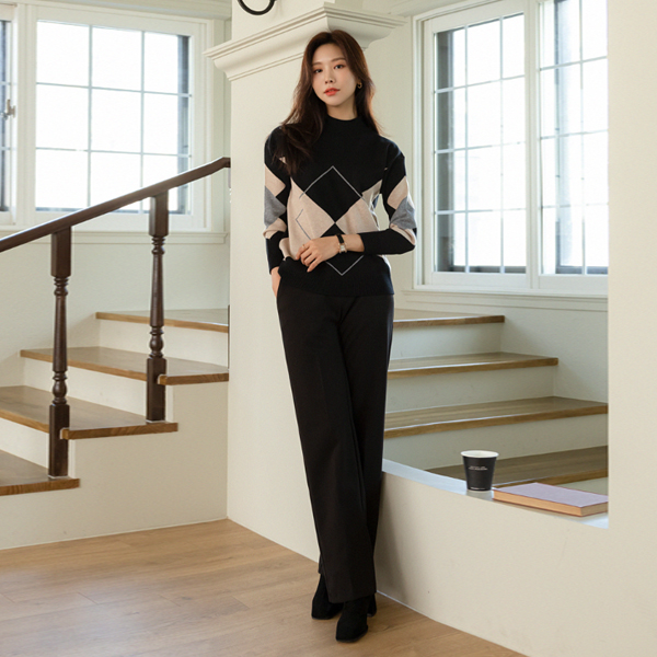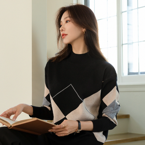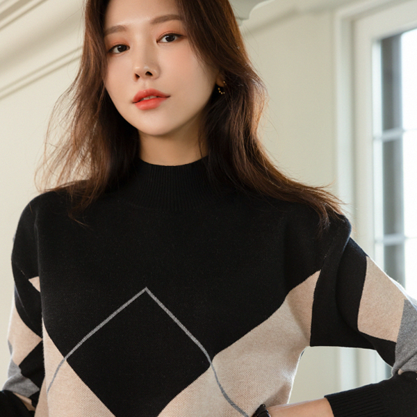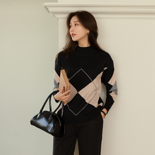 Argyle Patterns Point Half-Highneck Turtleneck Knit
