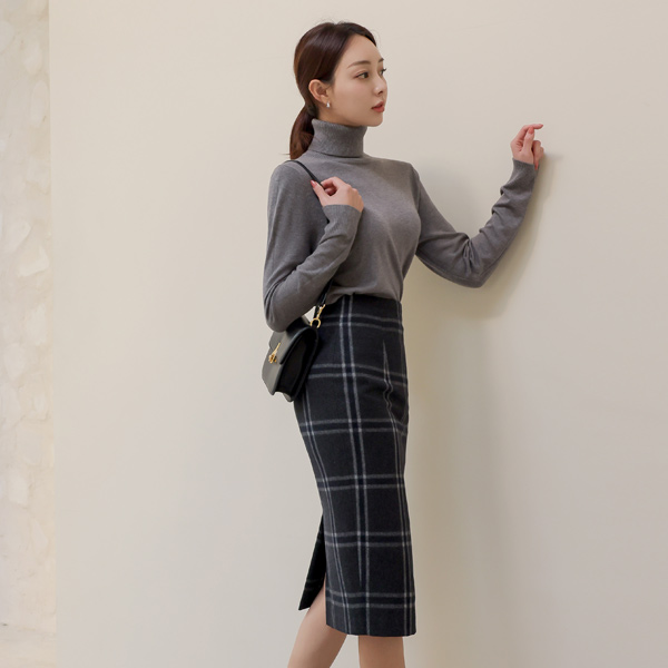 grid Check High-Waist Wool Skirt