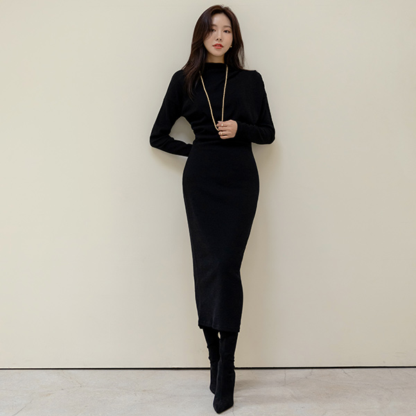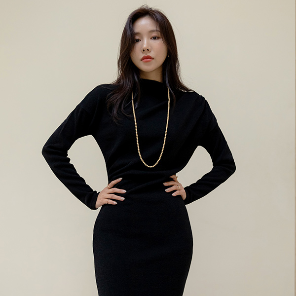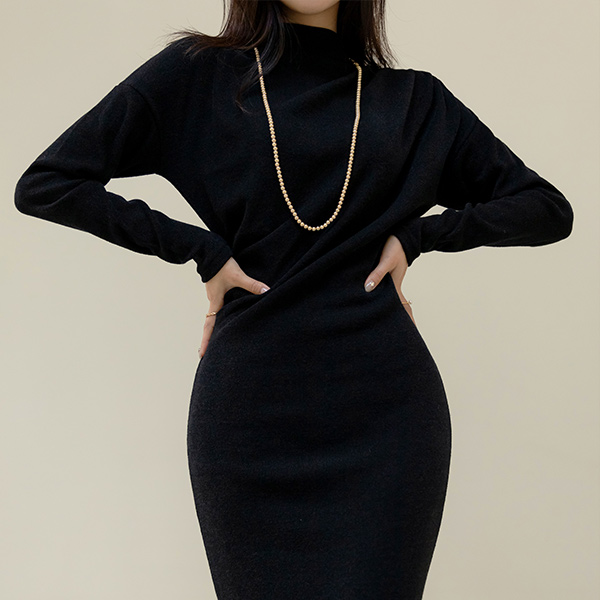 Double Shirring Point Half-Highneck Long Tension Dress