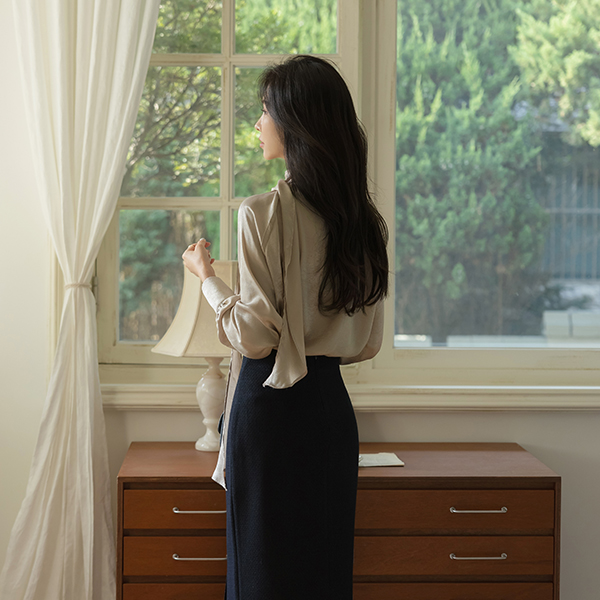 Shining Scarf-Neck Shirring Blouse