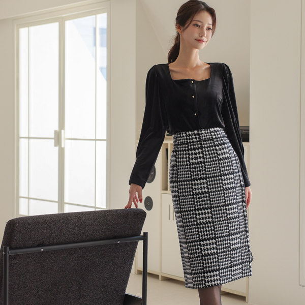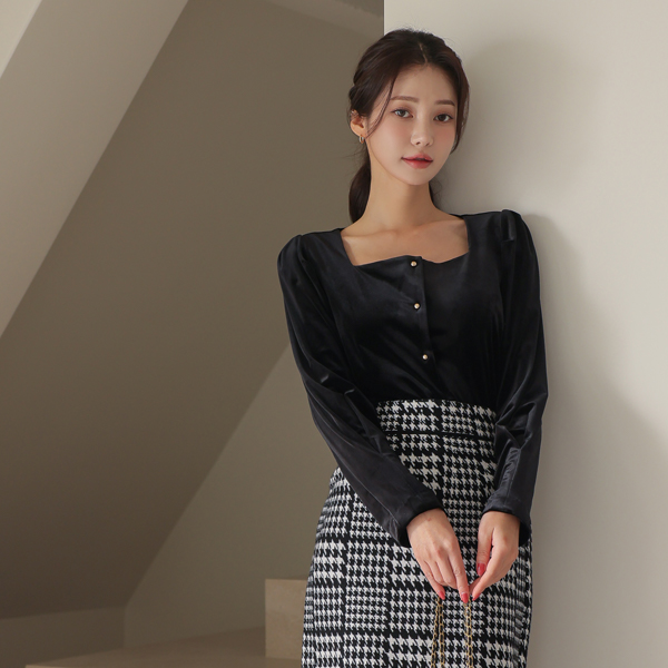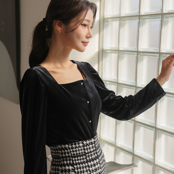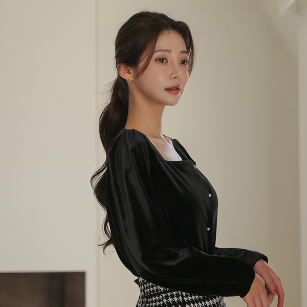 Velvet Square Neck Gold Ball Button Blouse