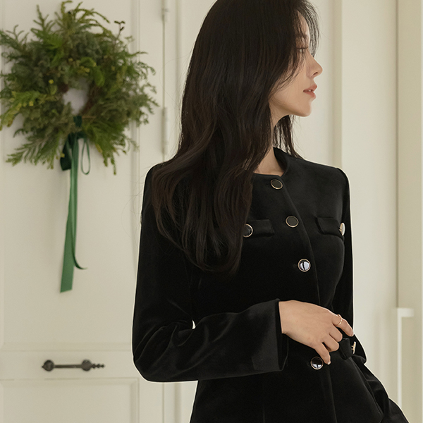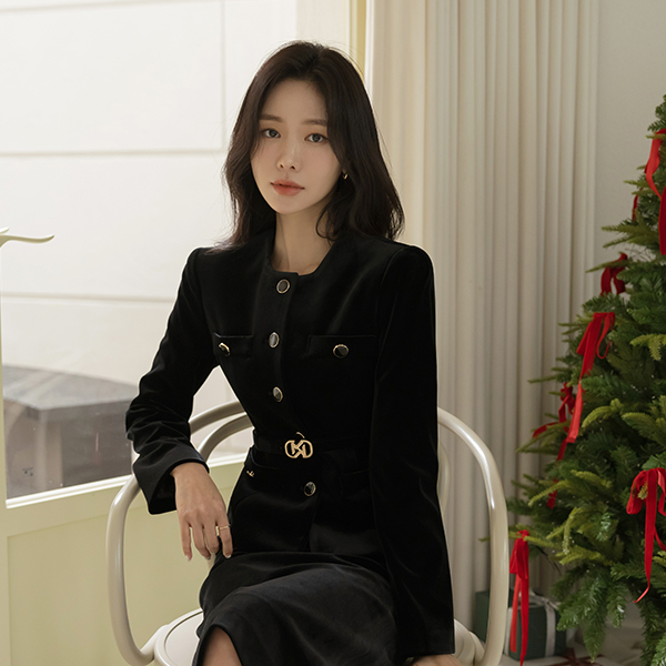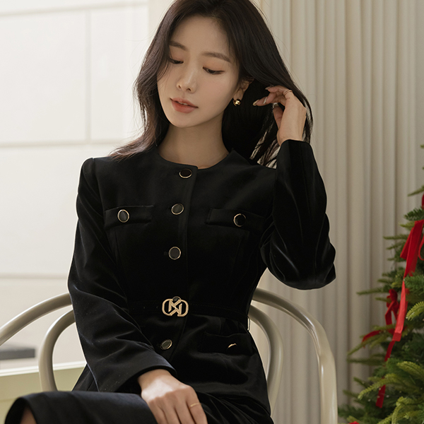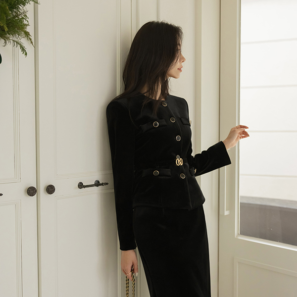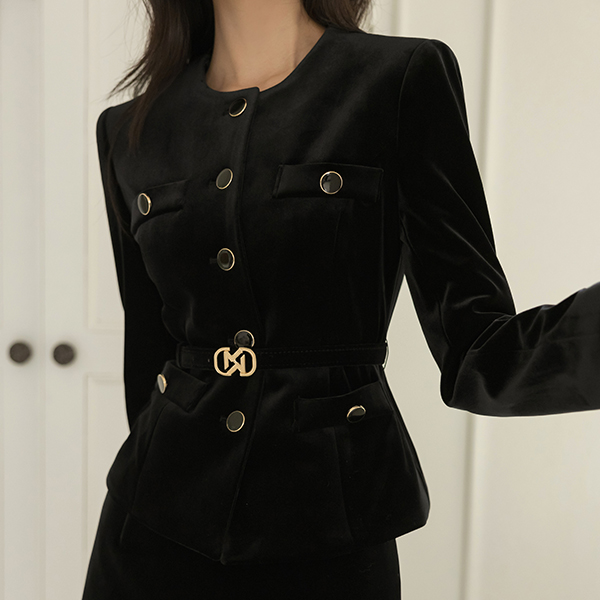Gold Button Velvet Slim Fit Jacket (BeltSET)