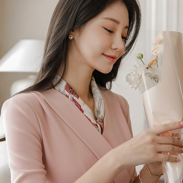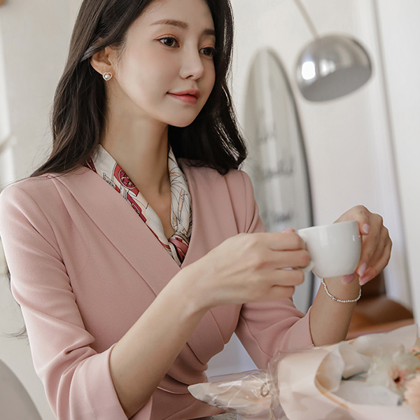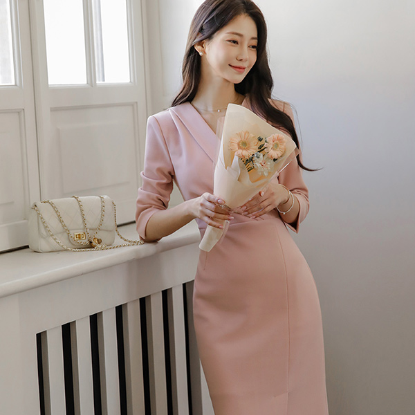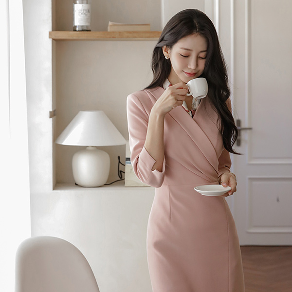 폴딩넥 Wrap Side Shirring Three-Quarter Sleeves Slit Span Dress