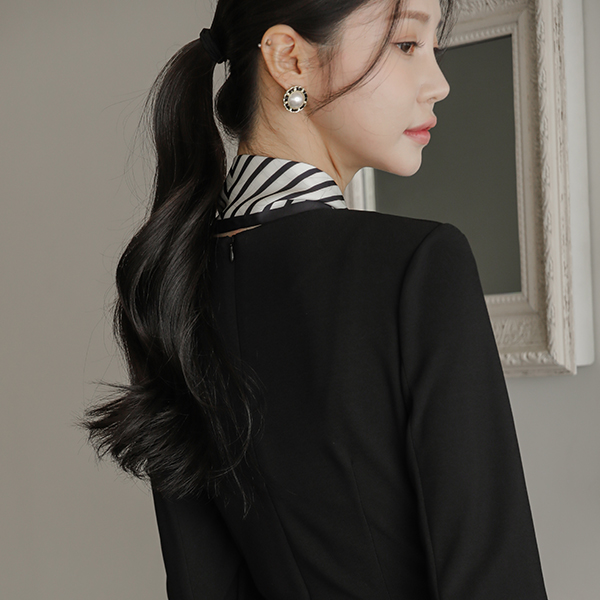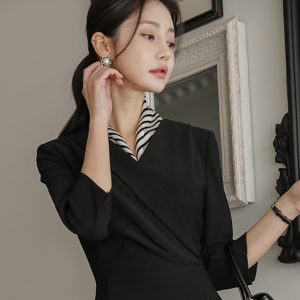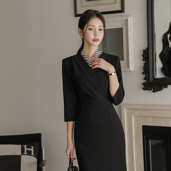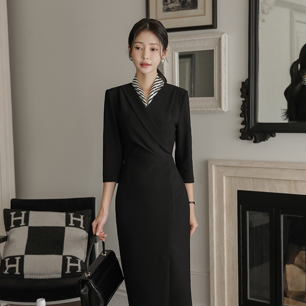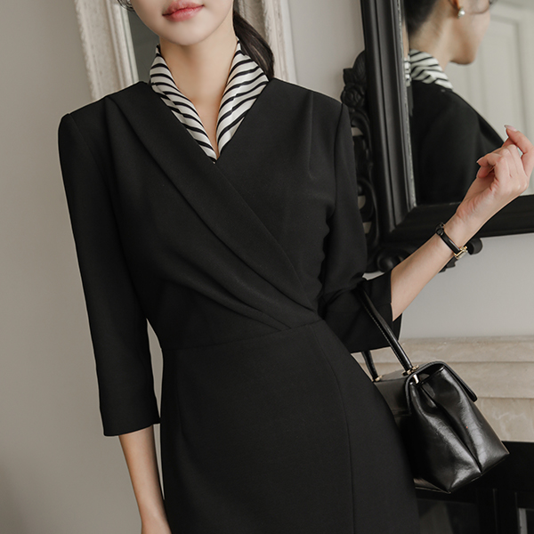 폴딩넥 Wrap Side Shirring Three-Quarter Sleeves Slit Span Dress