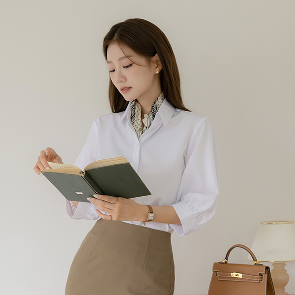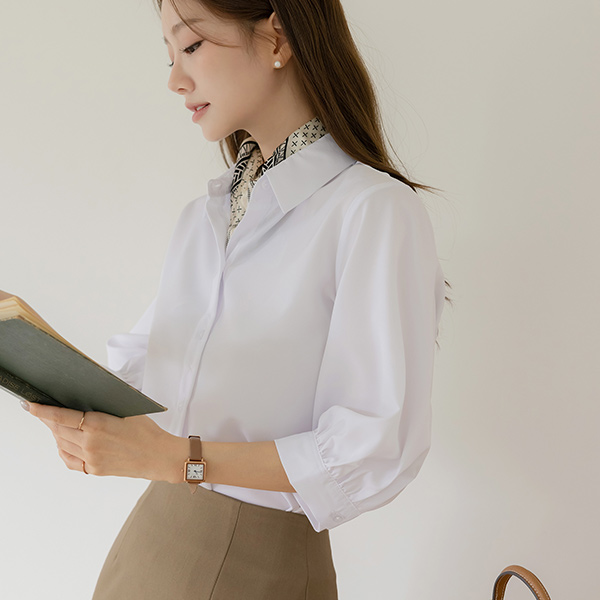 (1+1할인) Shirring Three-Quarter Sleeves Soft Span Blouse