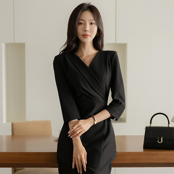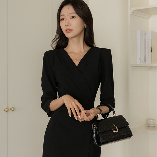 폴딩넥 Wrap Side Shirring Three-Quarter Sleeves Slit Span Dress Ⅱ