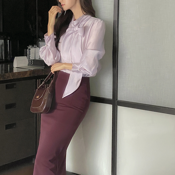 Elegance Ribbon Half-Highneck Pearl Sleeves Blouse