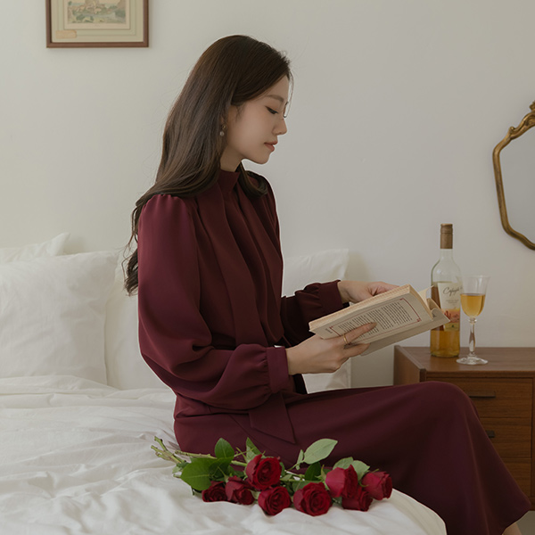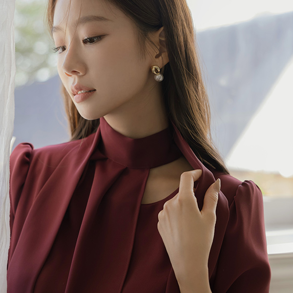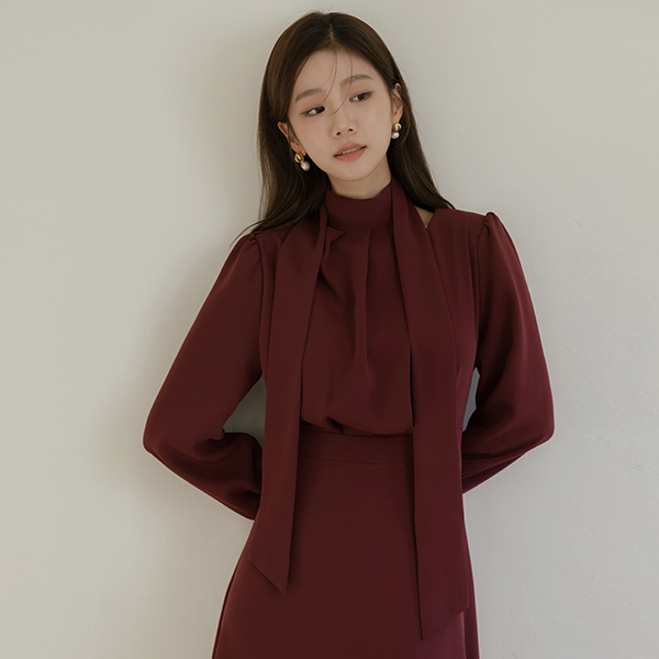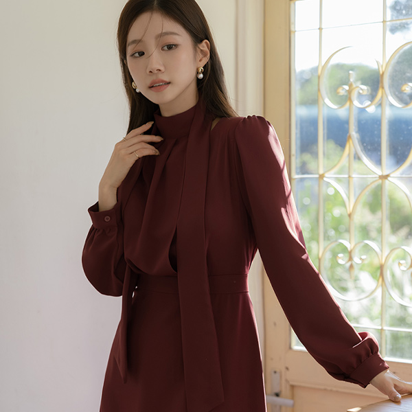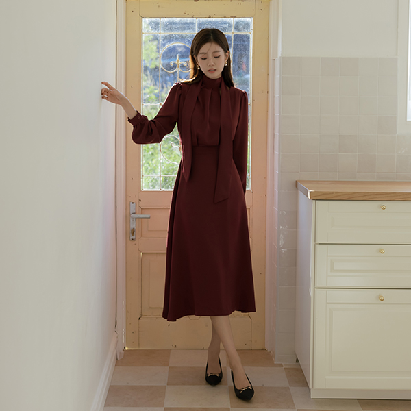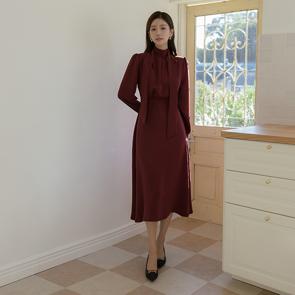 Cutting-Neck Pintuck Scarf A-line Dress