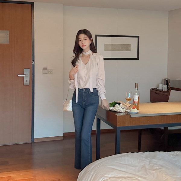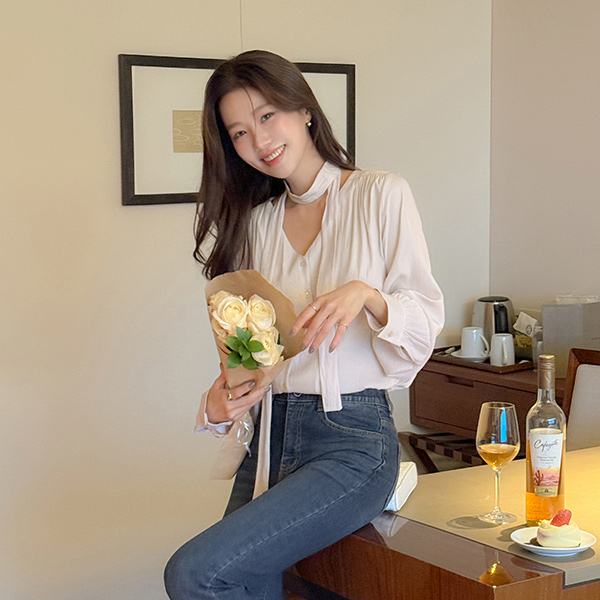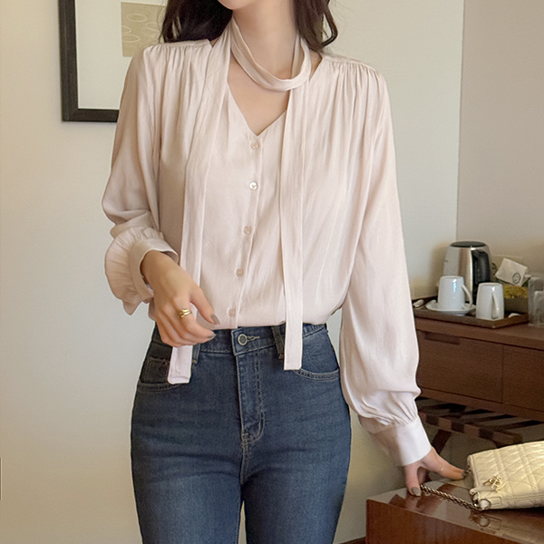 멜로 Shirring Tie Neck Blouse