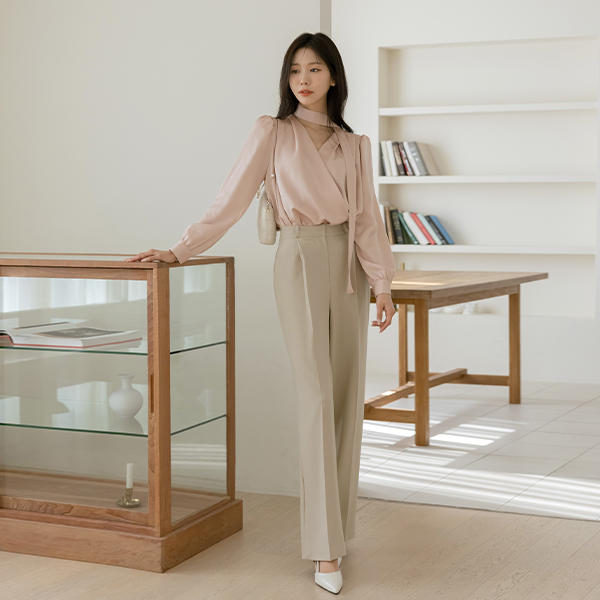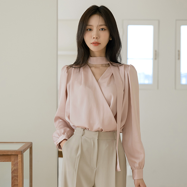 Glossy Wrap Style Tie Neck Blouse