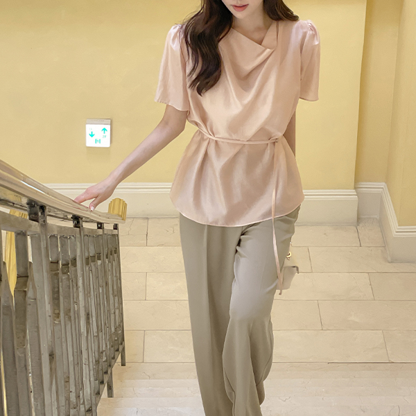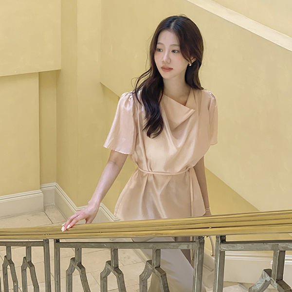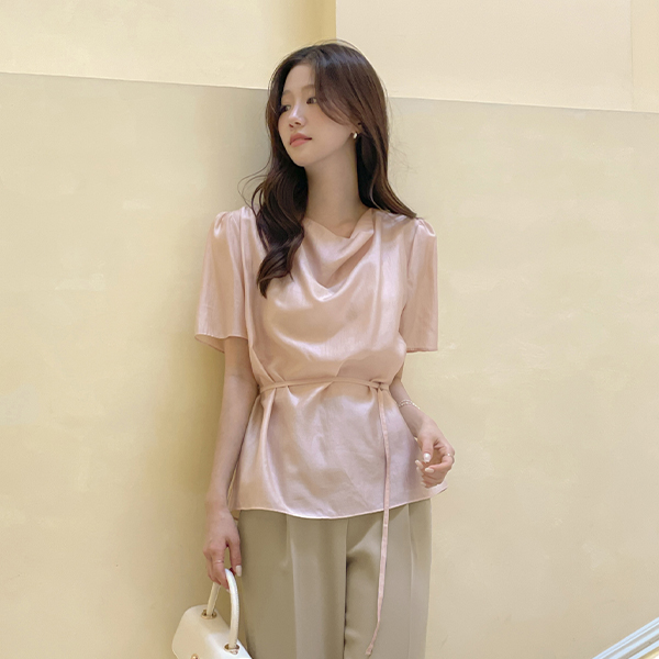 Loel Glossy Cowl Neck Short-sleeve Blouse(+Belt)