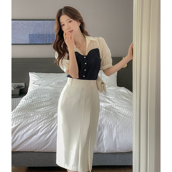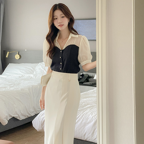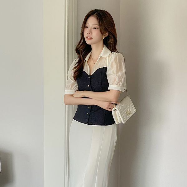 Color Combination Tweed Bustier See-through Blouse