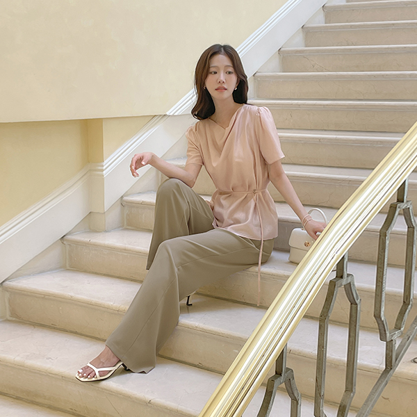 Loel Glossy Cowl Neck Short-sleeve Blouse(+Belt)