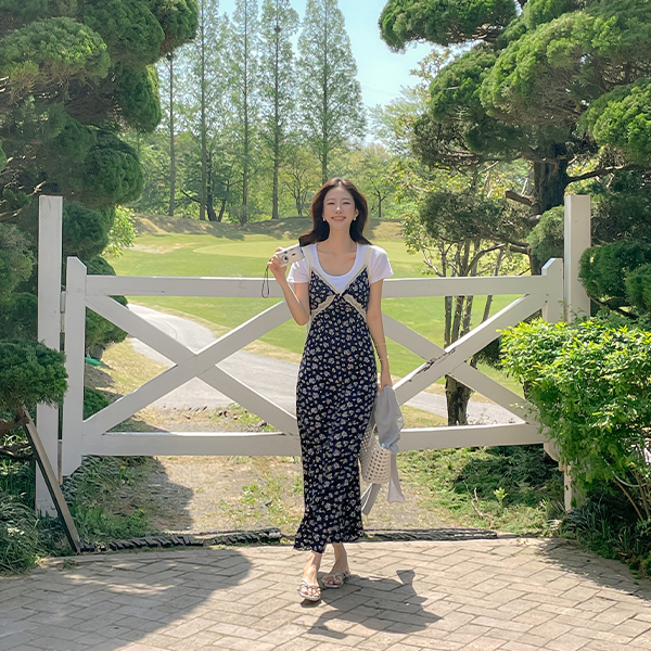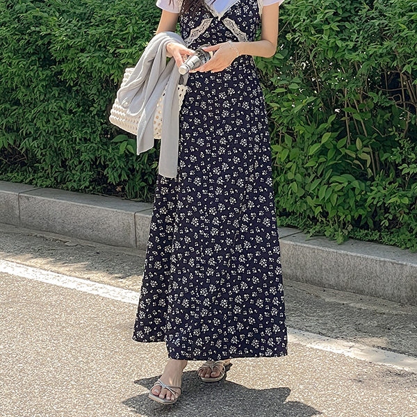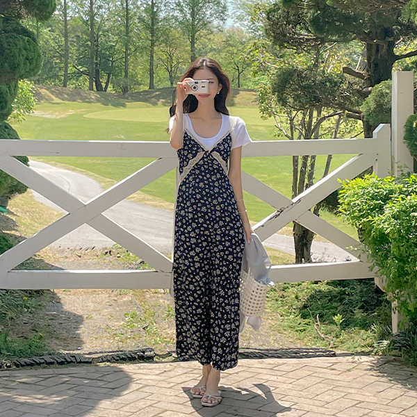 Feminine Floral Lace Back Banding Sleeveless shirts Long Dress