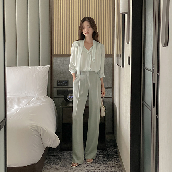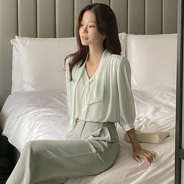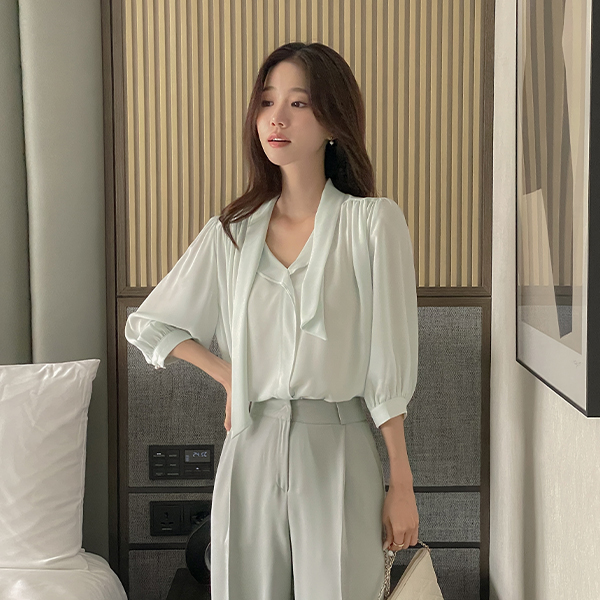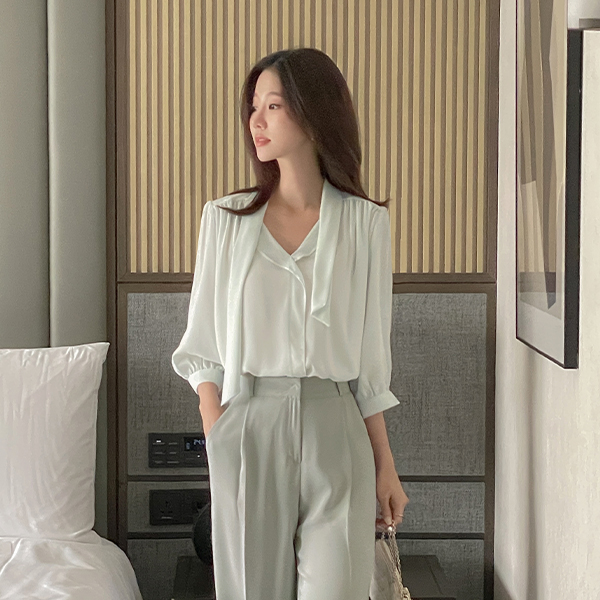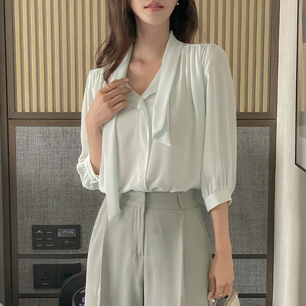 Soft Unbalance Tie Neck Three-Quarter Sleeves Blouse