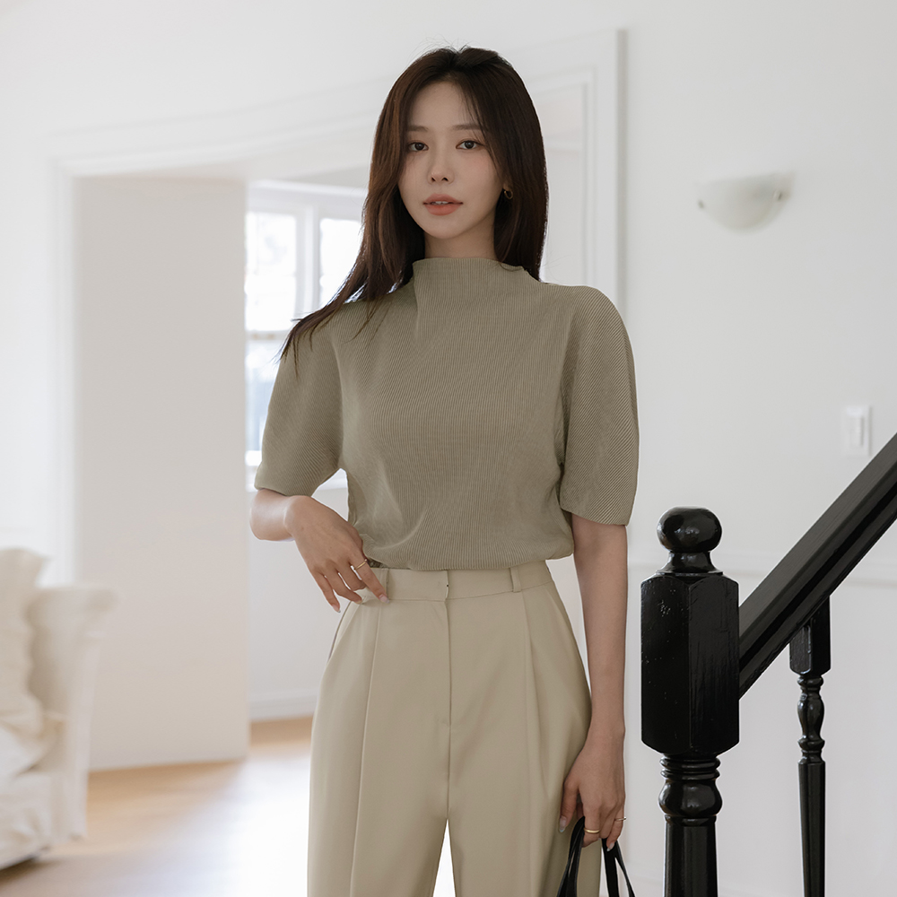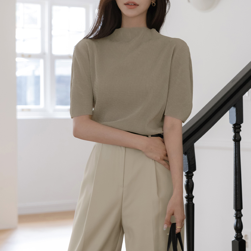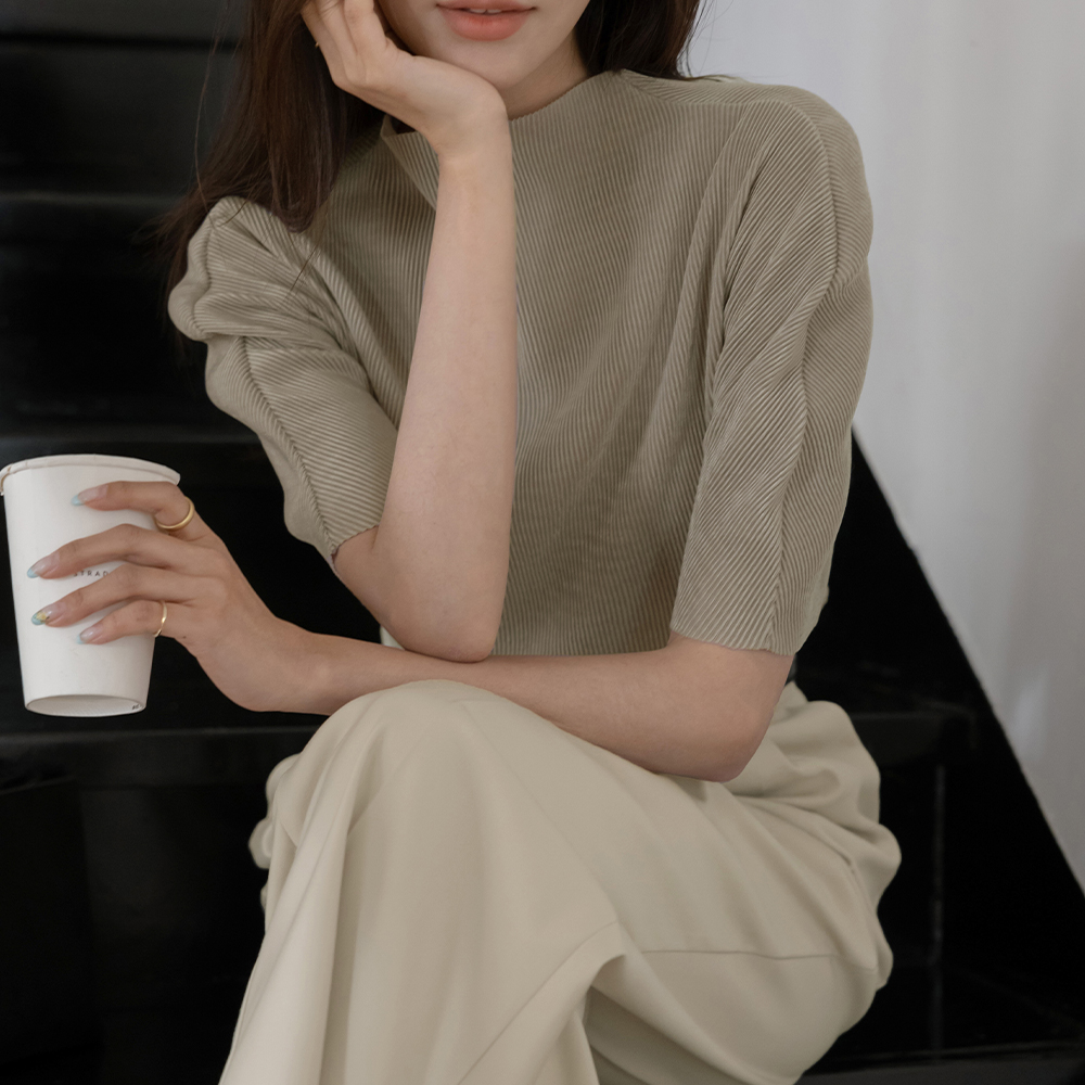 Half-Neck Velvet Pleats Short-sleeve T-shirt