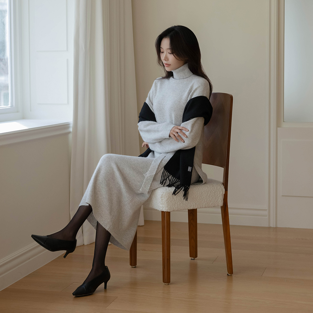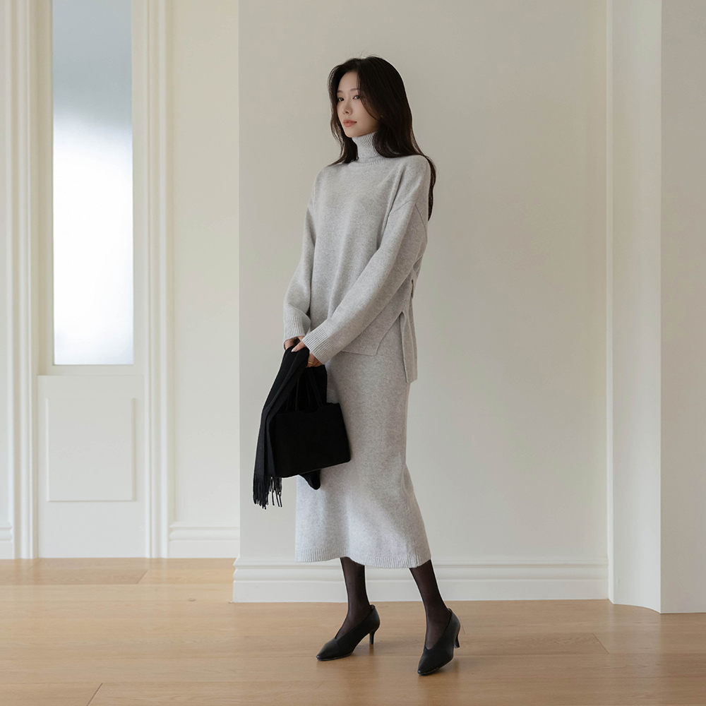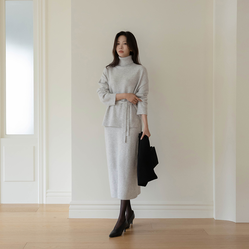 Cozy raccoon Turtleneck Strap Belt Set-up Knit