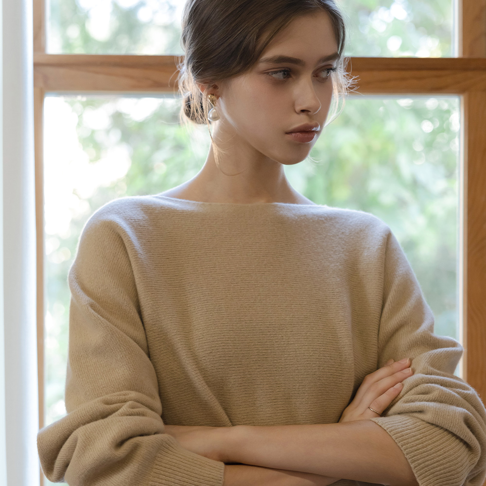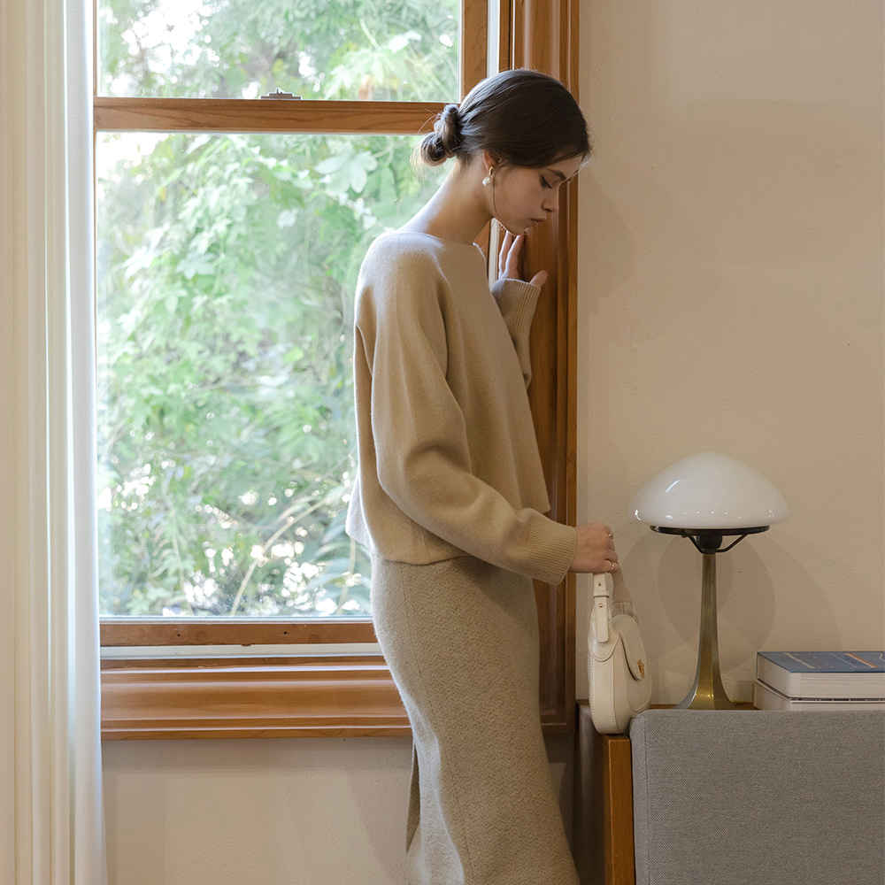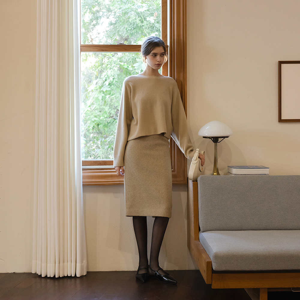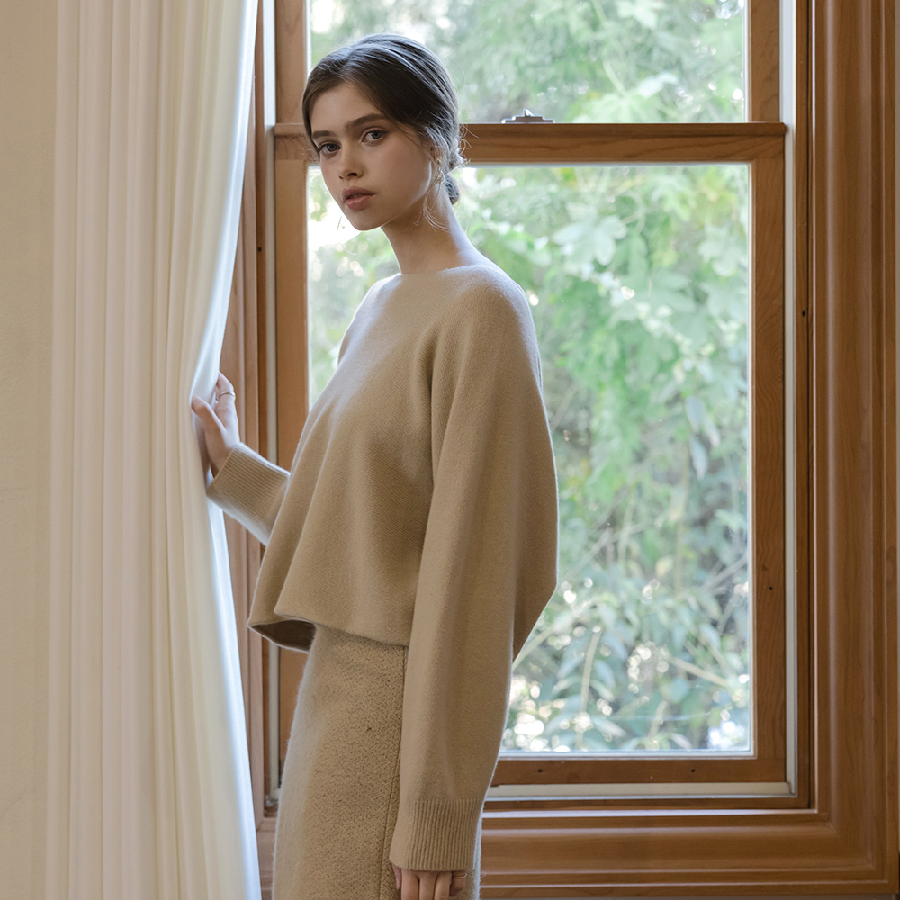 Boat Neck Cashmere&Wool Whole Garment Crop Knit