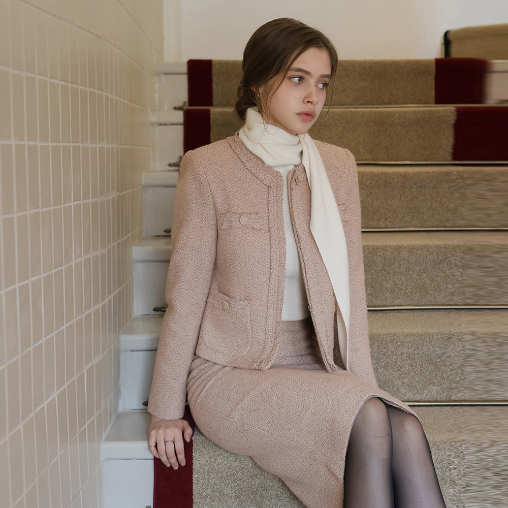 Rosy mix Wool Tassel Tweed Set-up Jacket