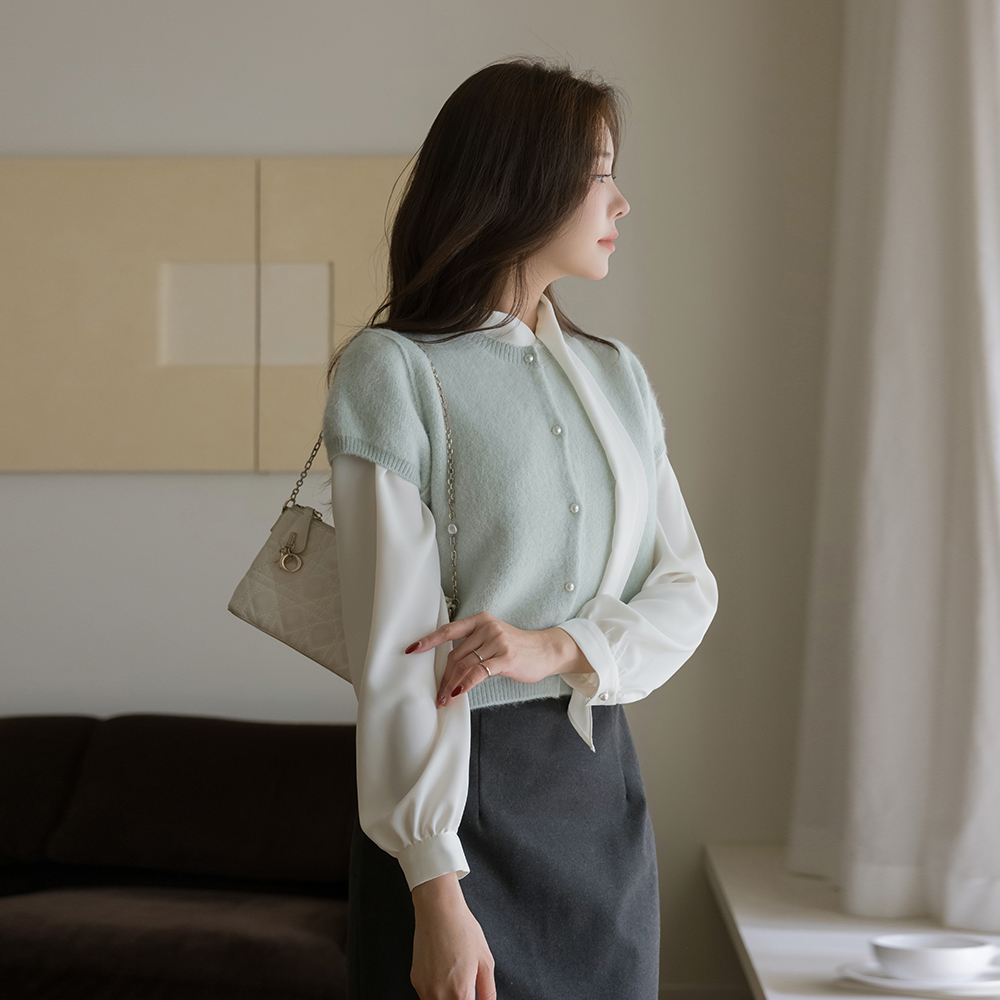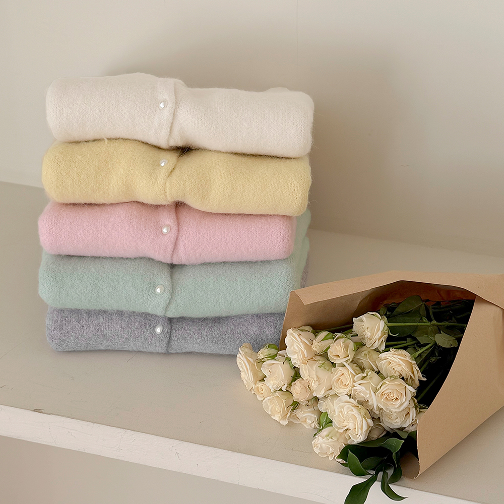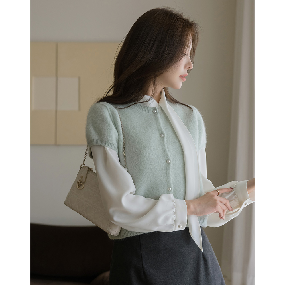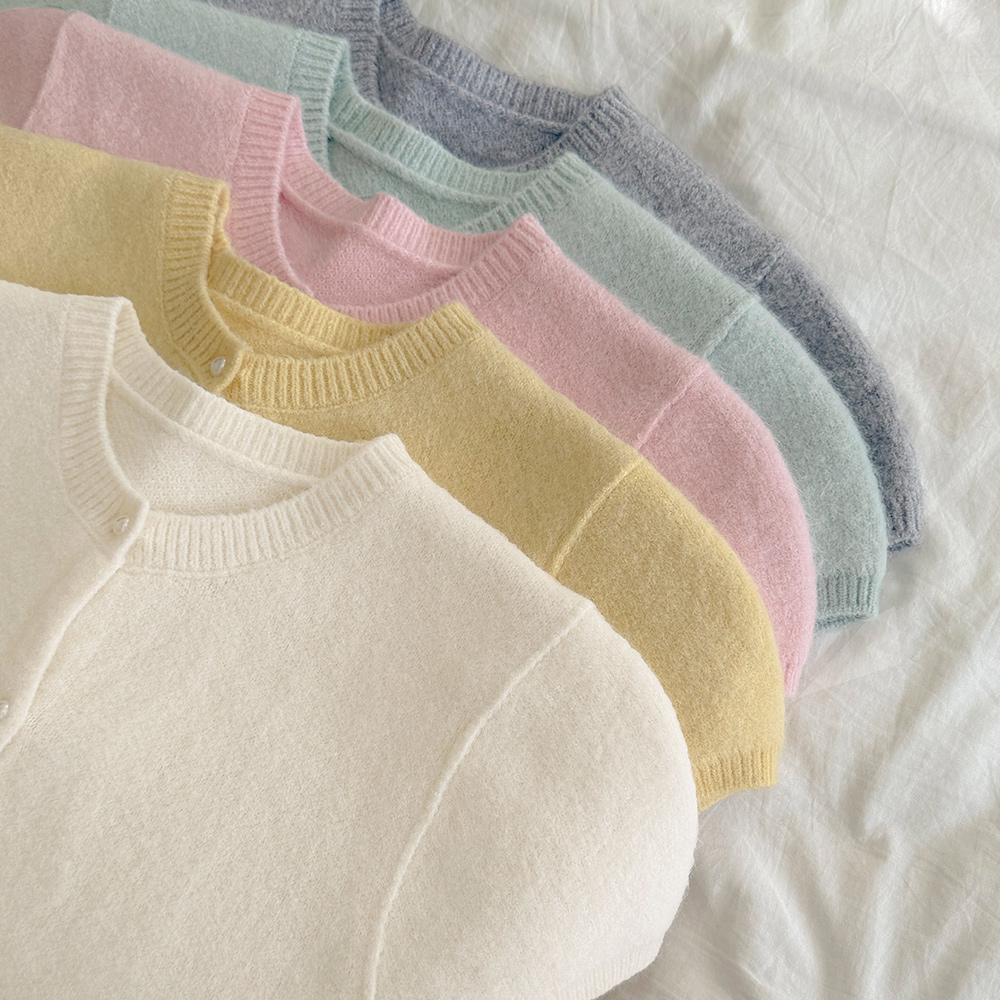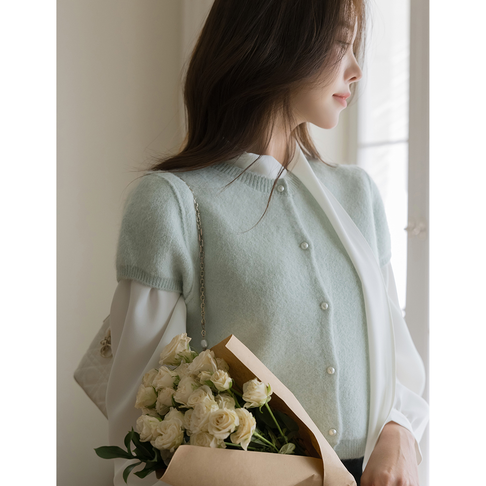 Pastel Raund neck Pearl Short-sleeve Knit Cardigan