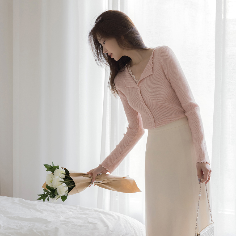 Open-Neck Lace Corduroy Flower Button Knit