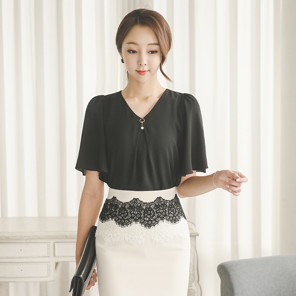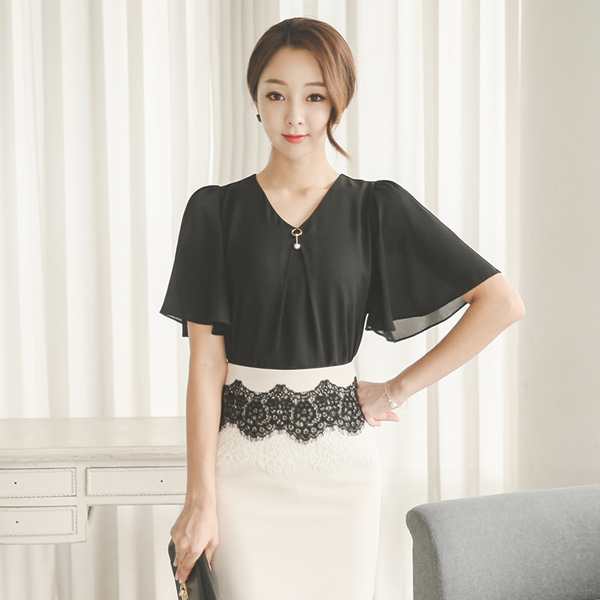 V-neck ring Pearl wing sleeve Blouse