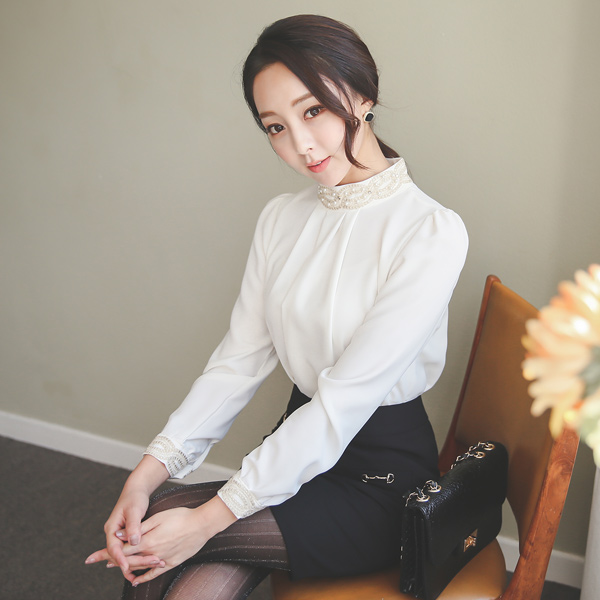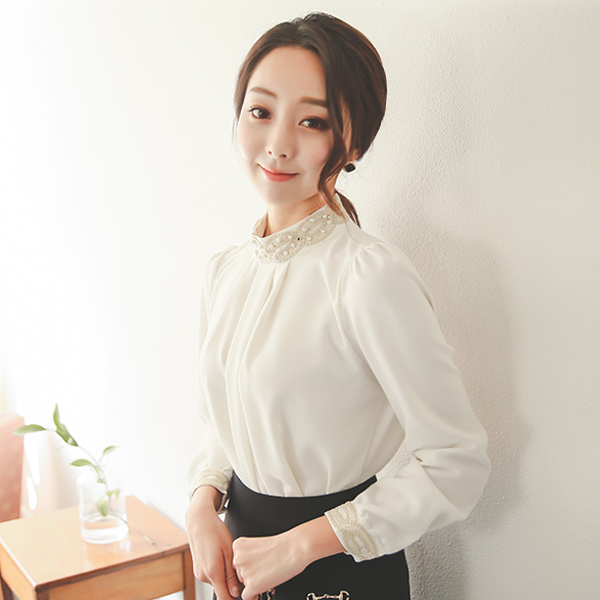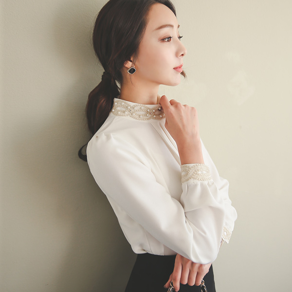 Gold Embroidery Pearl Neck Shirling Blouse