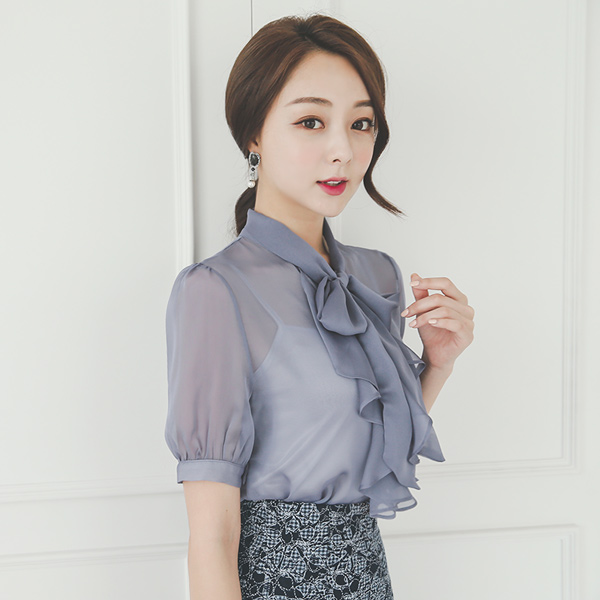 Shea Ribbon Ruffle See-through look Blouse (Short Sleeve)