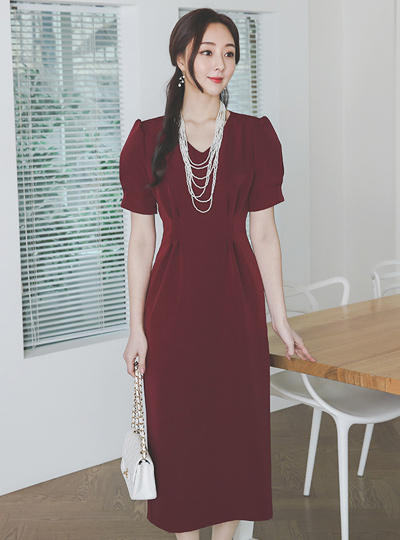 Pintuck V-neck Puff Midi-Dress