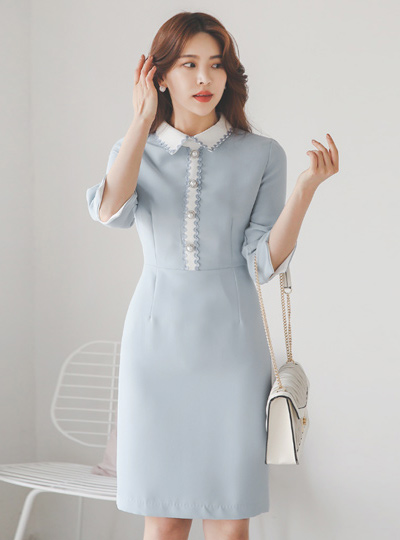Wave Pearl Buttons Color Scheme Collar Dress