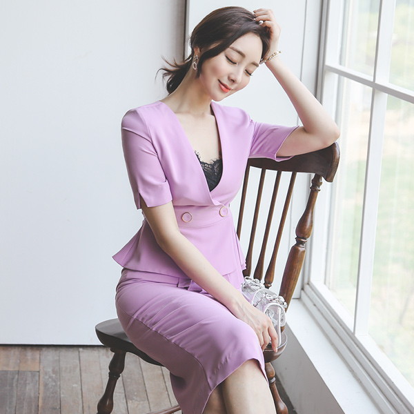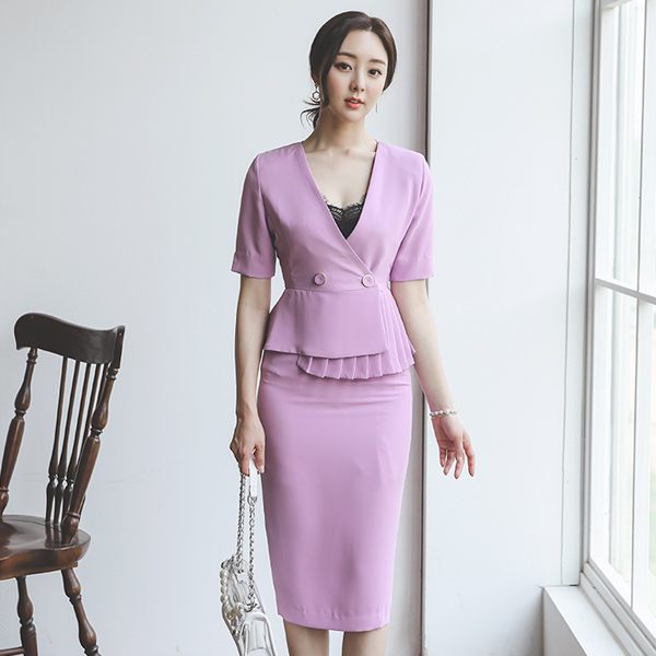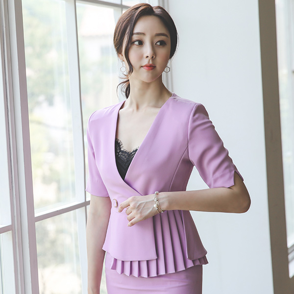 Unbalance Pleats Wrap Style Double-button Two-Piece SET