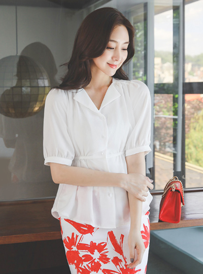 Open-Collar Shirring String Belted Blouse