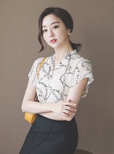 Gold-Ring Chain Printing Pintuck V-neck Blouse