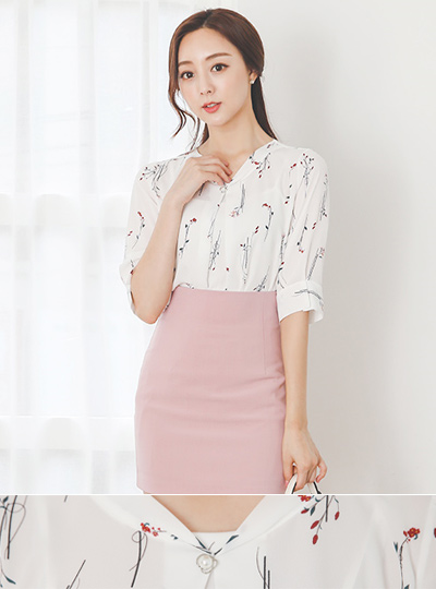 Flower-Pattern Pearl Buttons Pintuck Blouse