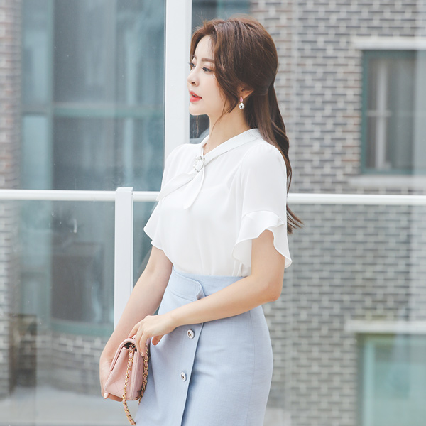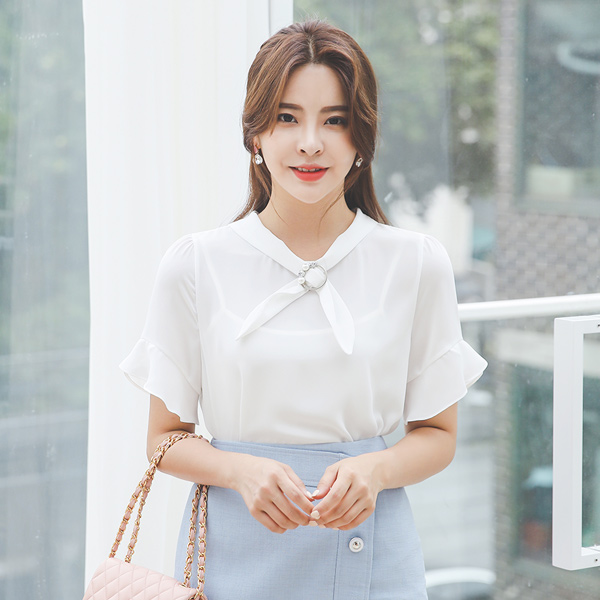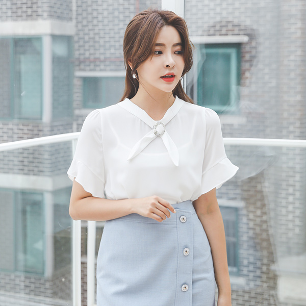 Pearl Silver Ring Tie Ruffle Sleeves Blouse