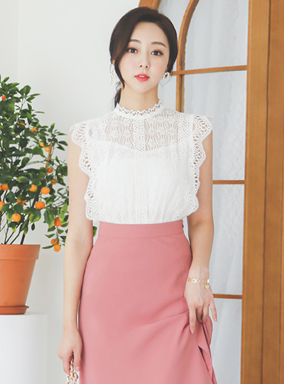 Lace Embroidery High-Neck Shine Banding Blouse