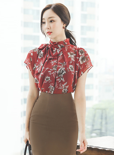 Brick Rose Scarf-Neck Chiffon Blouse
