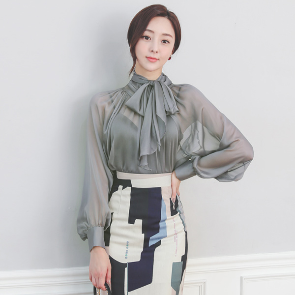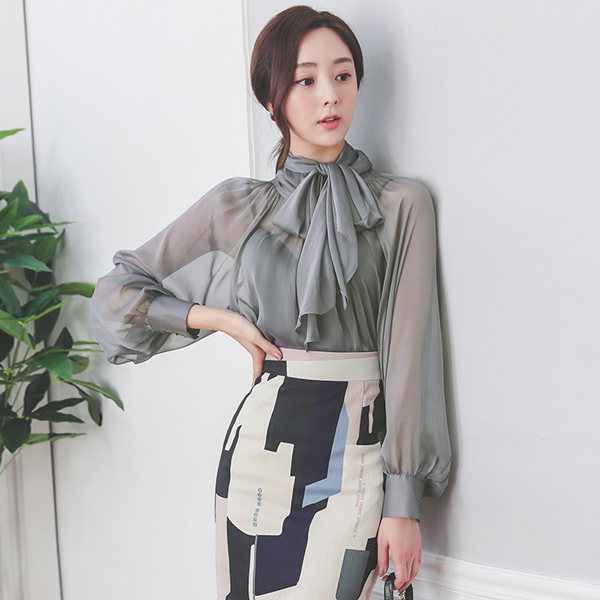 See-through Satin Cuffs Scarf-Neck Blouse