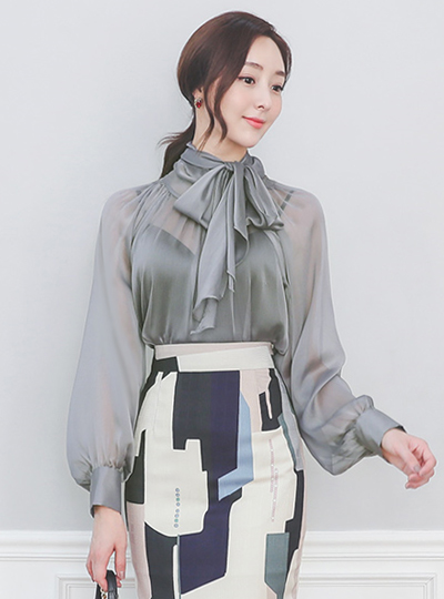 See-through Satin Cuffs Scarf-Neck Blouse