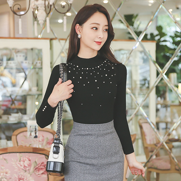 Pearl Decoration Half-Turtleneck Corduroy Knit