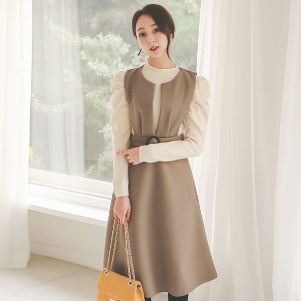 Slit Raund neck Wool Flared Dress