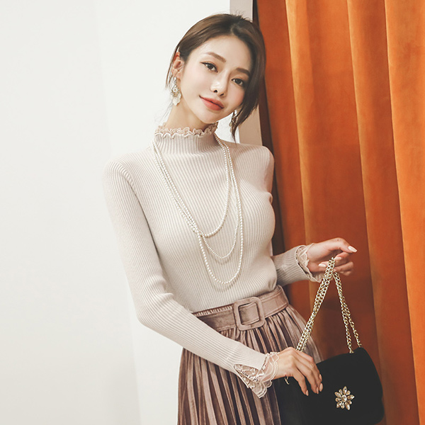 Lace layered Corduroy Knit T-shirt