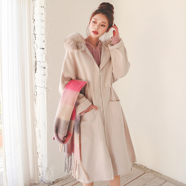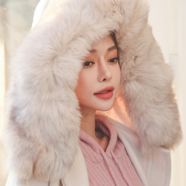 Real Fox-Fur Hood String Hand-Made Wool Coat