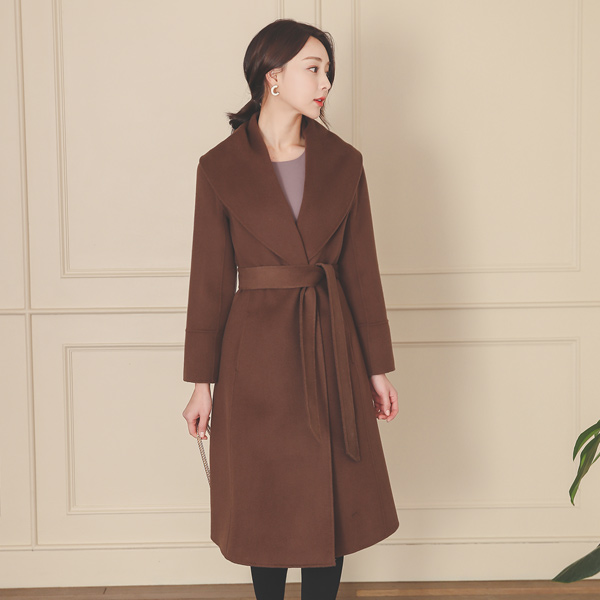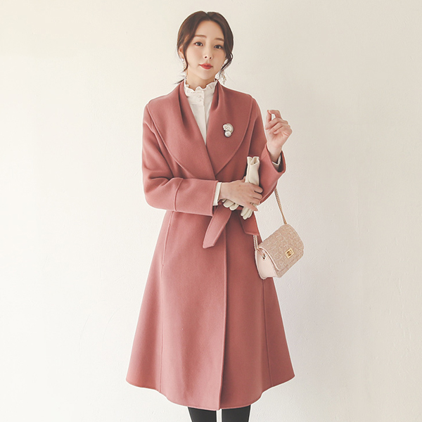 Wide Shirring Shawl Collar Belted Hand-Made Wool Coat