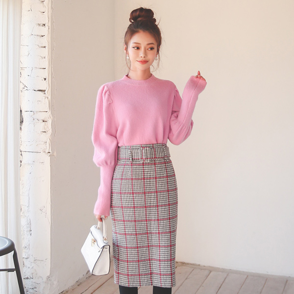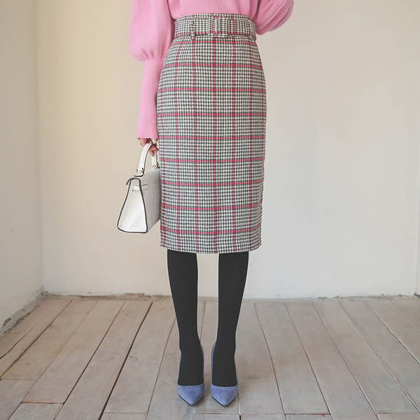 Color Hound's-Tooth Belted Wool Skirt